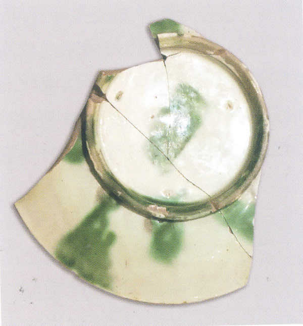 目前,“盈”字款白瓷仅见邢窑有烧造,河南巩义窑未见发现。另外,前几年浙江慈溪上林湖荷花芯窑址,曾发现三块印有“盈”字款的越窑青瓷标本。笔者认为,这也可能是与大盈库有关的器物 ,还有可能是模仿进奉的“盈”字款器,其字义与邢窑“盈”字款器大致相同。至于低温绿釉“盈”字款器,目前只了解在西安大明宫遗址有部分标本发现,邢窑、巩义窑窑址均未发现,因此难以肯定其确切产地。不过,诸多邢窑白釉“盈”字款器的发现和“黑石号”载有邢窑白瓷产品及绿釉“盈”字碗和白地绿彩“进奉”款盘的情况,确实很难把这种器物排除在邢窑之外。在河北, 曾见有与“黑石号”“盈”字碗风格相近的绿釉花口碗、白釉绿彩执壶等器物。2017 年,笔者曾在河北博物院展览中见到当地发现的一件与“进奉”盘风格相似的器物碎片(图 14),圈足风格基本一致,底中心也有相似的局部施釉。还有一块唐代绿釉碗残片玉环形底足(图 15),与“黑石号”“盈”字碗底足十分相似。