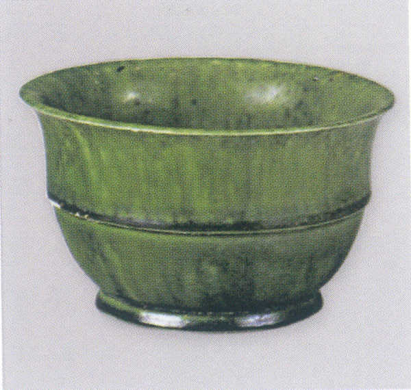 唐代北方巩义窑和邢窑,均曾生产过唐三彩和绿釉及白釉绿彩器,“黑石号”沉船中的绿釉及白釉绿彩器与北方同类产品风格相同。海外有研究者曾测试过“黑石号”绿釉与白釉绿彩器的化学成分,所测八个样品数据证明它们均应产自巩义窑。 “黑石号”上的白釉绿彩器和绿釉器,其中一部分是中档产品,有的甚至质地较粗。但另一部分是精细或者说是高规格的器物,有些迄今未见其他地区发现,而底刻“进奉”款的白釉绿彩盘(图11)和底刻“盈”字款绿釉五瓣花口碗(图12)是两件特殊的器物,均属首次发现。