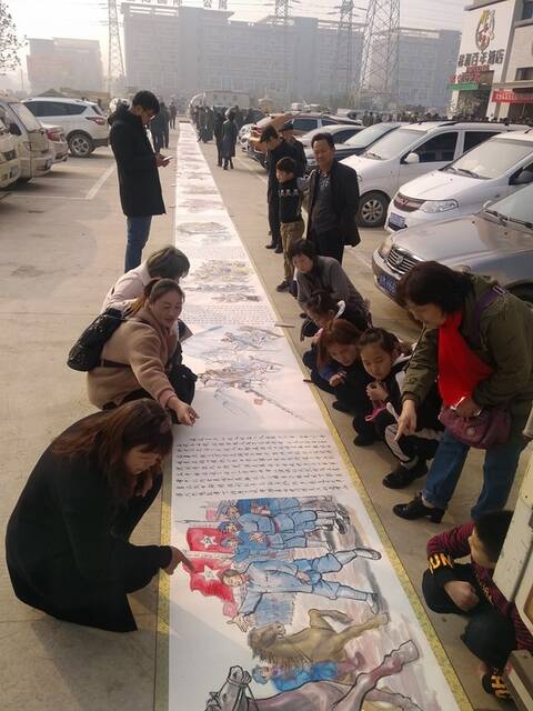 11月25日,由安徽和谐传统文化研究院主办的“纪念红军长征胜利82周年百米书画长卷”在安徽阜阳市祥和百年酒店隆重展出。阜阳市关工委副主任宁义南、阜阳市颍泉区关工委主任牛宗汉、阜阳市颍泉区循环经济园区管委会党组书记王玉利、安徽省书协副主席、阜阳市书画院名誉院长任智以及书画艺术界、阜阳市第四中学学生联谊会、原阜阳城南初中师生联谊会200多人参加展览开幕式。