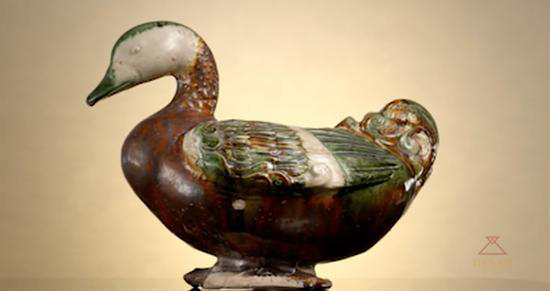 三彩鸳鸯尊,唐代,现藏于河南博物院。尊呈卧姿鸳鸯形,背部有椭圆形口,鸳鸯扁嘴长颈,昂首卷尾,两翼覆身,蹼足站在一块方形台板上,通体施黄绿白等彩釉加以装饰,色彩鲜艳,栩栩如生。
